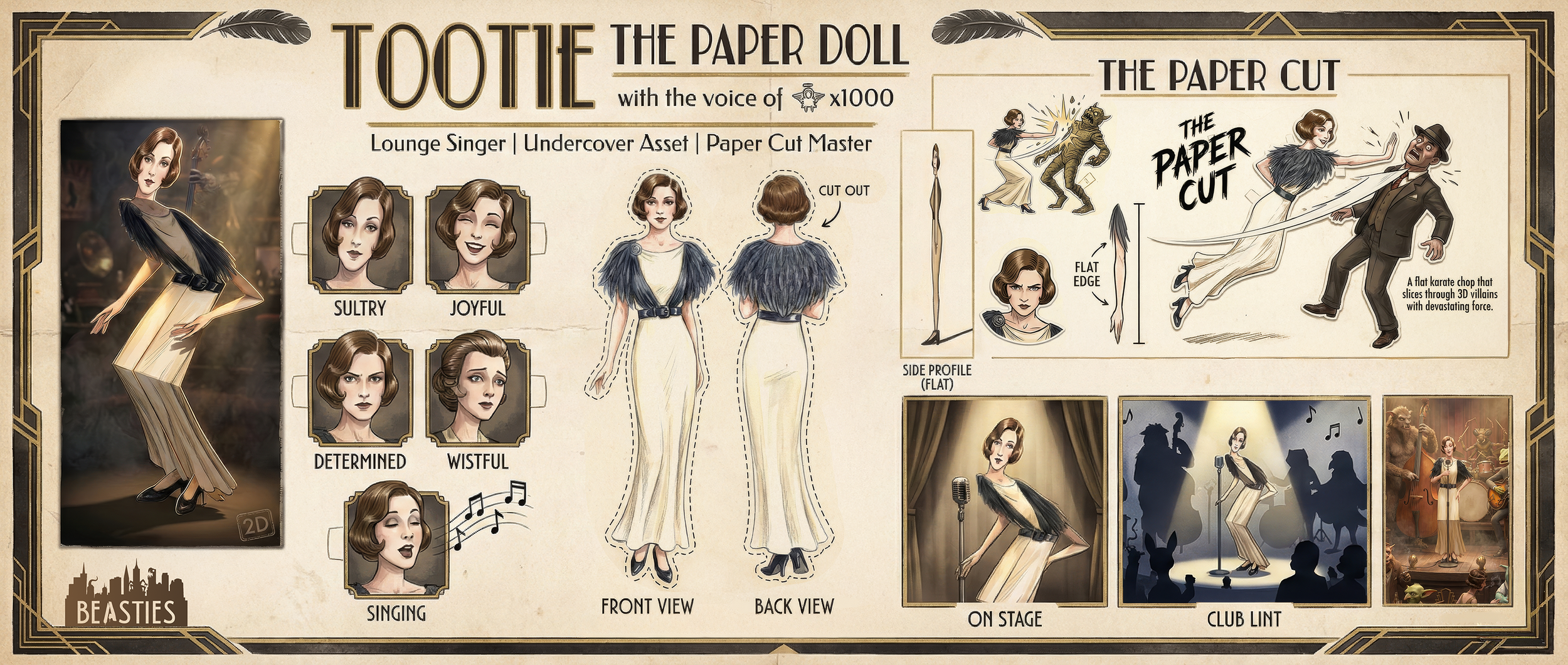 A two-dimensional lounge singer stranded in a three-dimensional world, Tootie disarms with an angelic voice and devastates villains with a single move she calls “The Paper Cut.” Warm, perceptive, and unexpectedly deadly, she’s the emotional core of the team.