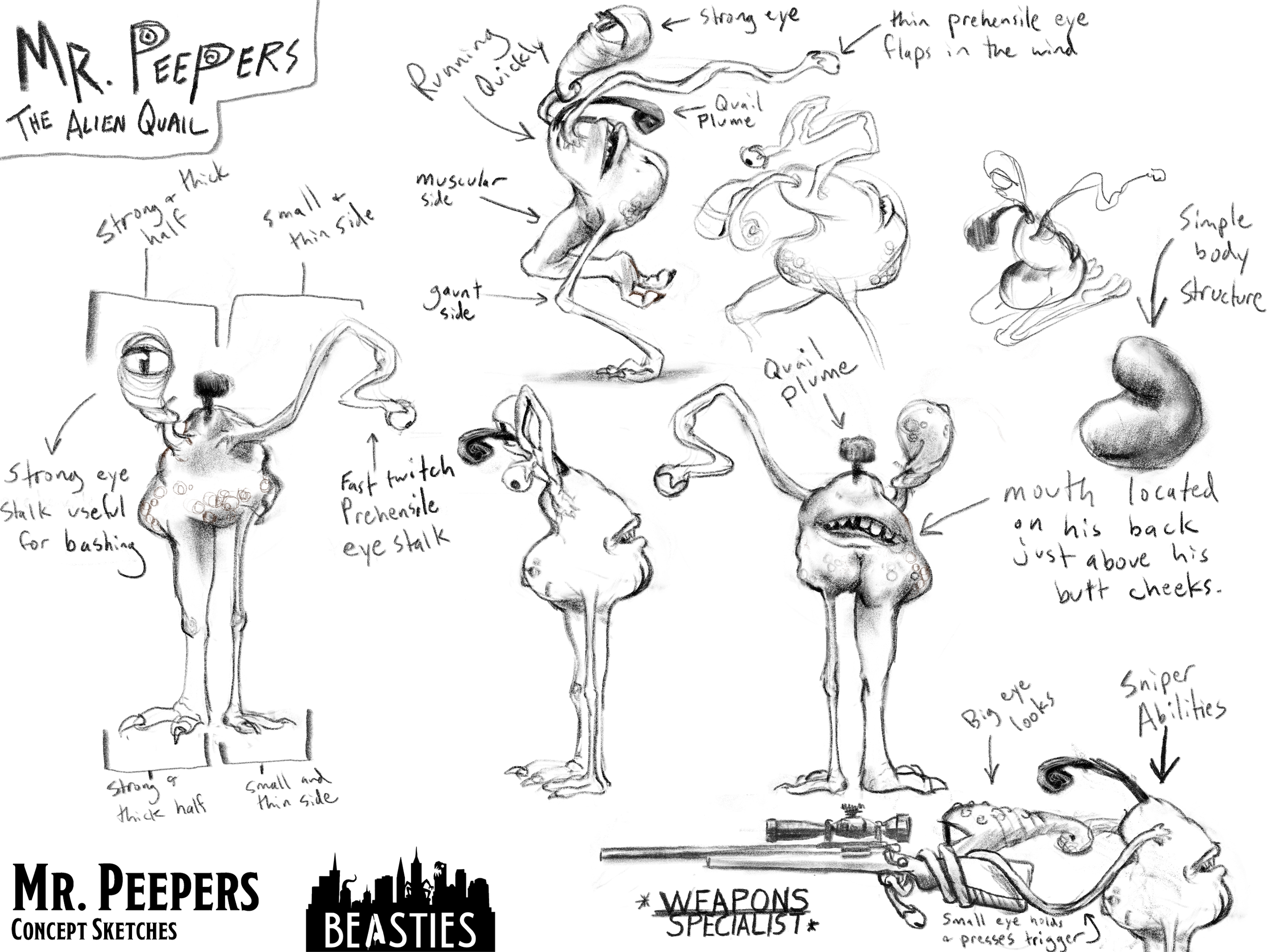 An alien quail and former interdimensional assassin, Mr. Peepers comes from a world torn apart by a pointless Righties-vs-Lefties war. With prehensile eyes and surgical precision, he now uses his lethal skills to protect rather than control, quietly guarding the team from the shadows. (side note…Mr. Peepers is a rightie…don’t get it wrong)