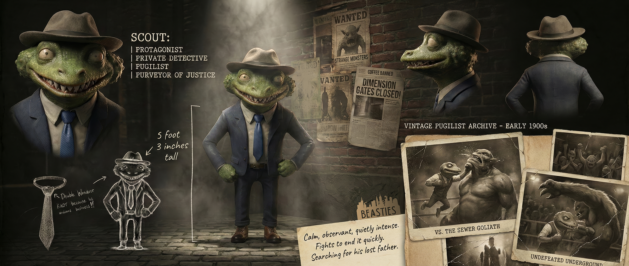 A hardboiled private detective and bare-knuckle pugilist, Scout leads the Besties in a corrupt, coffee-banned world where justice is for sale. Haunted by his father’s disappearance across dimensions, he takes on the cases the police are too corrupt to touch, guided by quiet resolve and an unshakable moral compass.